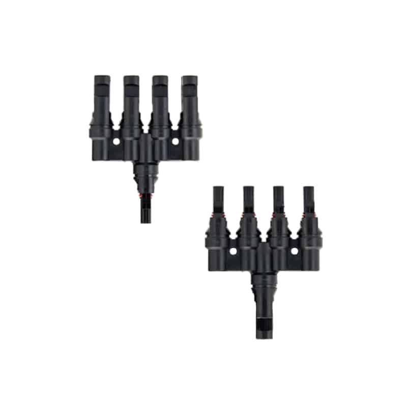 Notre PV-T5 MC4 Connecteur de dérivation à 4 voies simplifie le câblage en parallèle de quatre chaînes solaires. Ce raccord 1500V/50A IP67 permet une division fiable et sans contact (IP2X) de 1 à 4, réduisant ainsi le temps d'installation.